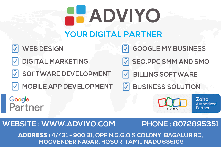 “Adviyo – Trusted software company in Hosur, Our services include Digital Marketing, Web designing, Software development, Web development & App development(IOS, Android, Hybrid). As a full-service digital agency, we specialize Website Design, Logo Design, Web Hosting, E-commerce & Startup Solutions. We leverage the latest tools and technologies to create engaging websites and applications that are optimized for performance and user experience. From SEO and PPC campaigns to social media management and content creation, we help our clients connect with their audience and achieve their business objectives. We are proud of our reputation for delivering exceptional service and support.”